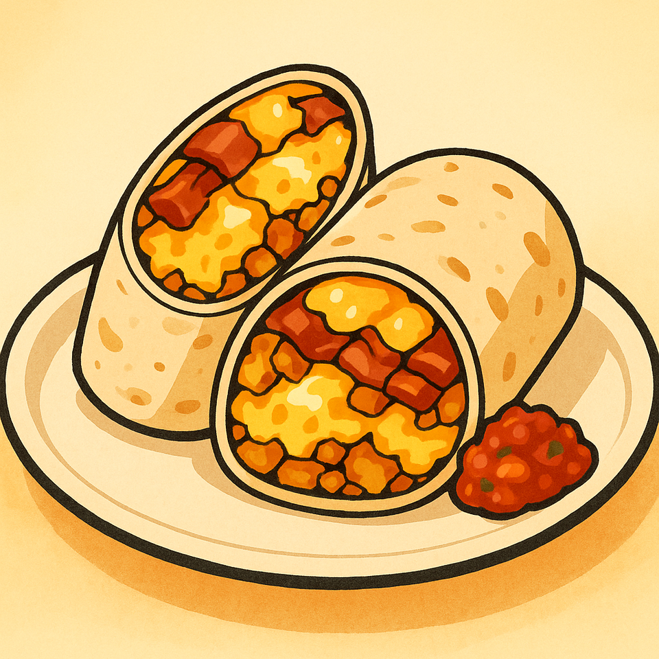 ไข่ 2 ฟอง, แฮชบราวน์, เบคอน, ซัลซ่า, ชีส, แป้งตอร์ติญ่าโฮมเมด