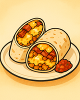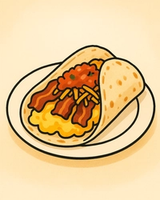 ไข่ 2 ฟอง, แฮชบราวน์, เบคอน, ซัลซ่า, ชีส, แป้งตอร์ติญ่าโฮมเมด